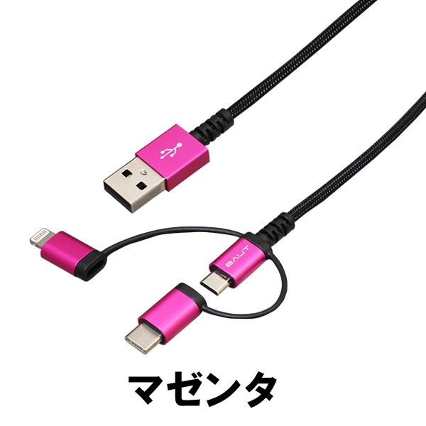 PREMIUM3way USBケーブル ●microUSB+TYPE-C+MFIライトニングコネクタがセットになった3Wayタイプ ●コネクタを変えるだけで簡単充電 ●高出力2A出力 ■仕様 LightningUSB・Type-C・microUSBオス/USB Aオス 規格:USB2.0 転送速度:480Mbps 対応出力:2.4A ケーブル長:約1.0m(コネクタを除く) メール便送料無料の注意点 ◇配送業社を選択される際は、必ず【メール便】を選択してください。